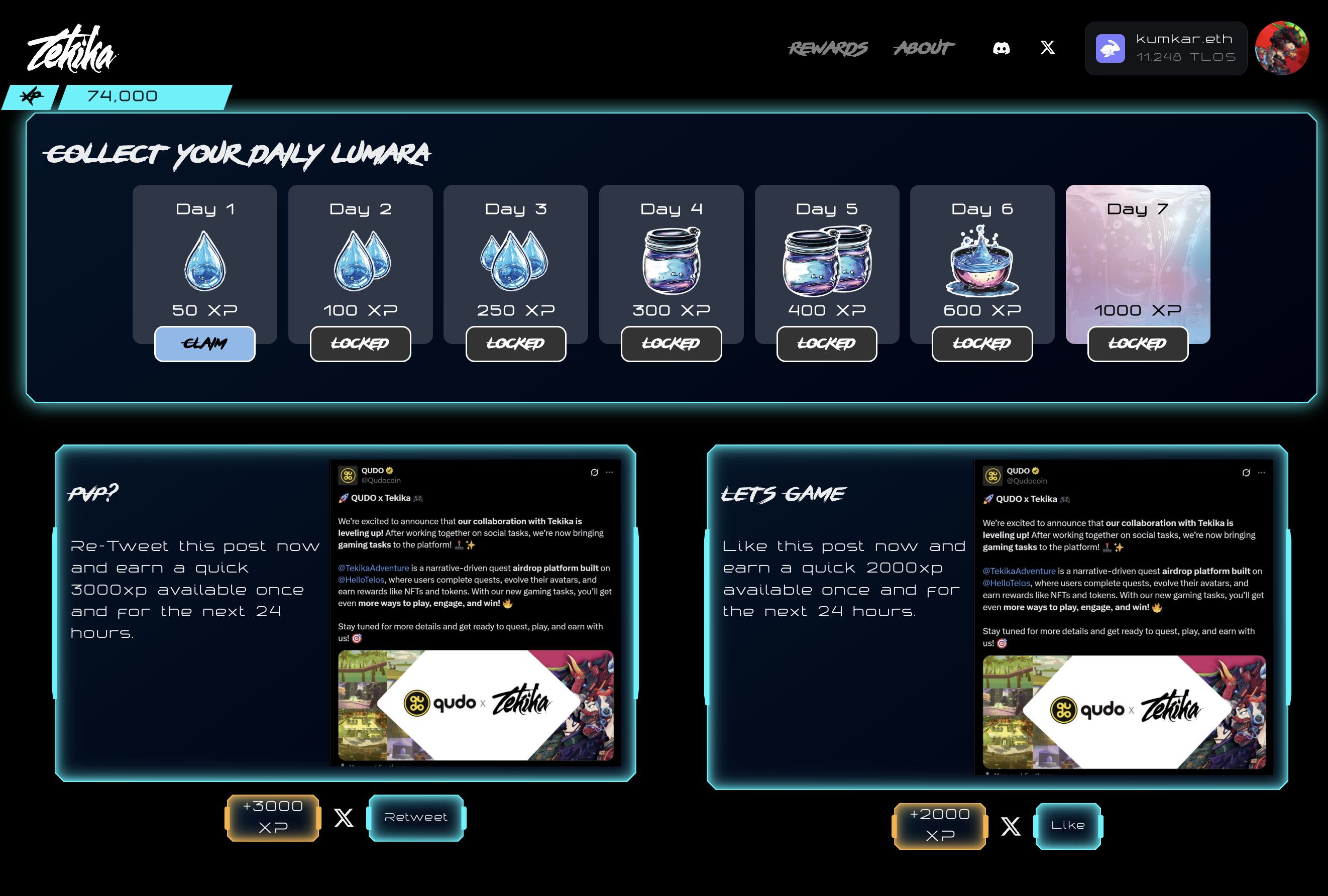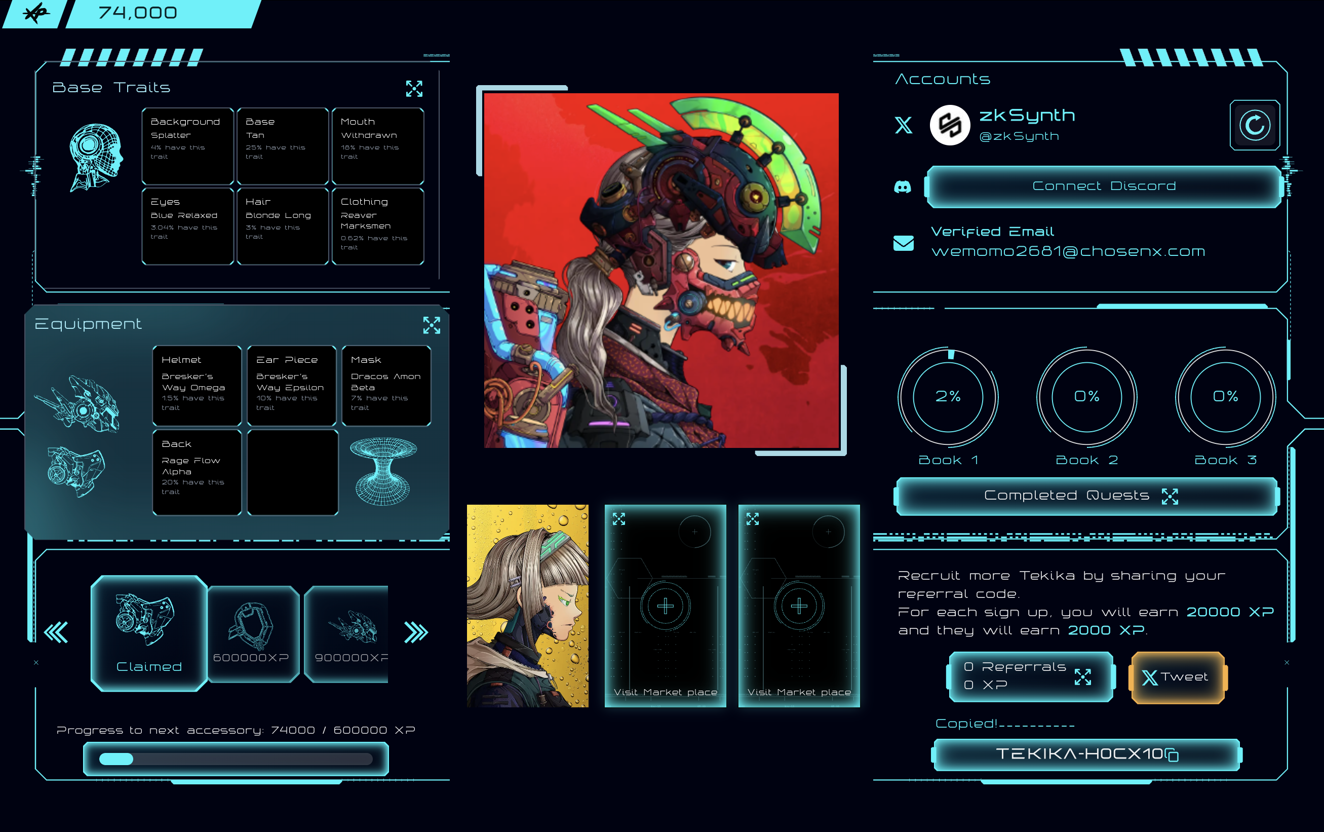 The user profile served as a central hub, aggregating all relevant information: NFT visual with equipped items, base traits, XP balance, $TLOS balance, Ticket count, narrative book progression, connected accounts status, completed quests overview, and referral system performance. This provided users with a clear overview of their status and progress within the Tekika ecosystem.