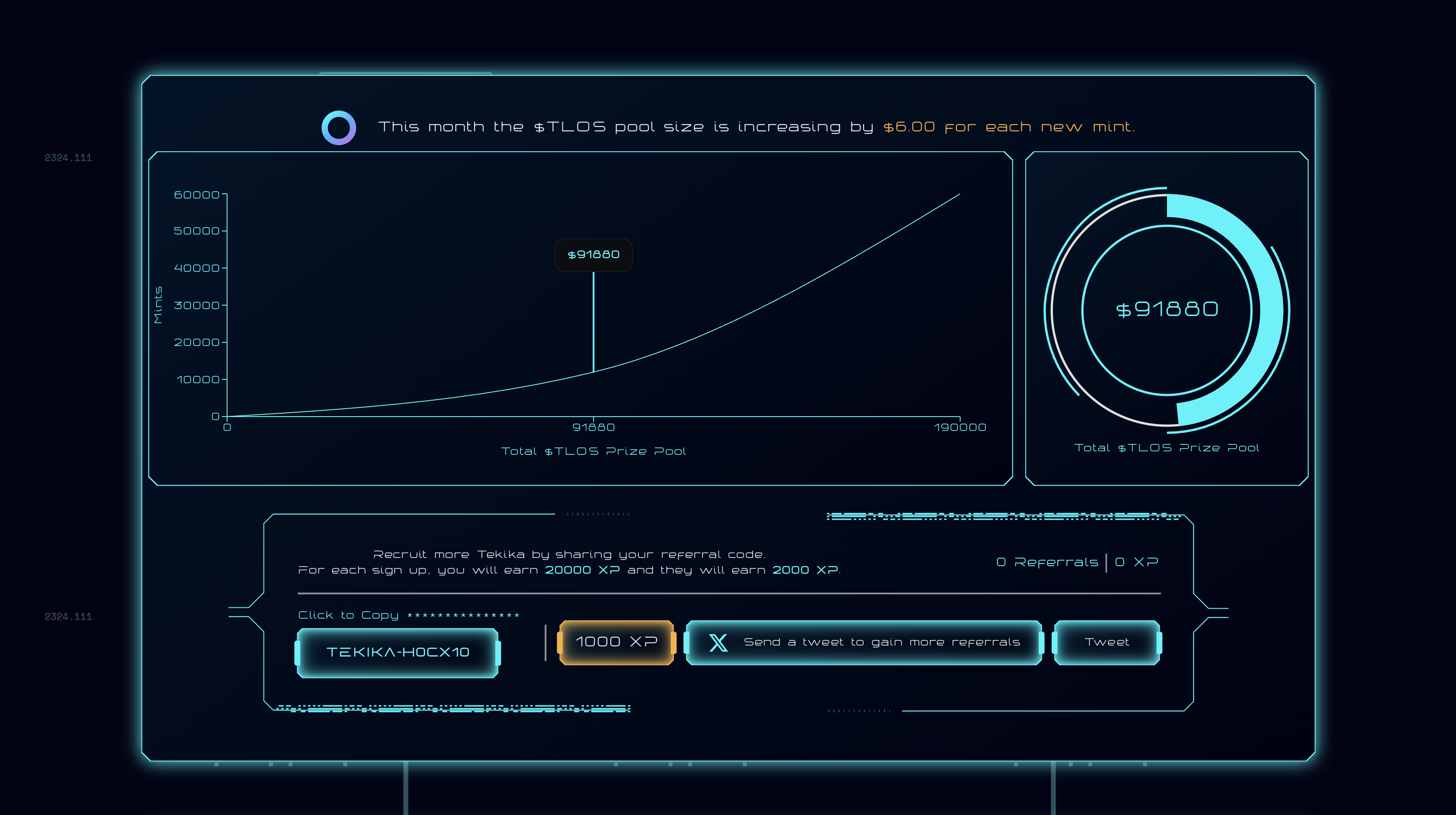 A major incentive was the dynamic $TLOS prize pool. This pool grew based on external factors (stated as $6.00 per new mint). We implemented clear data visualizations showing the pool's current value and growth. A dedicated claim module allowed users to withdraw their earned share periodically during defined monthly cycles, complete with claim history and social sharing ('Flex') features that awarded bonus XP.