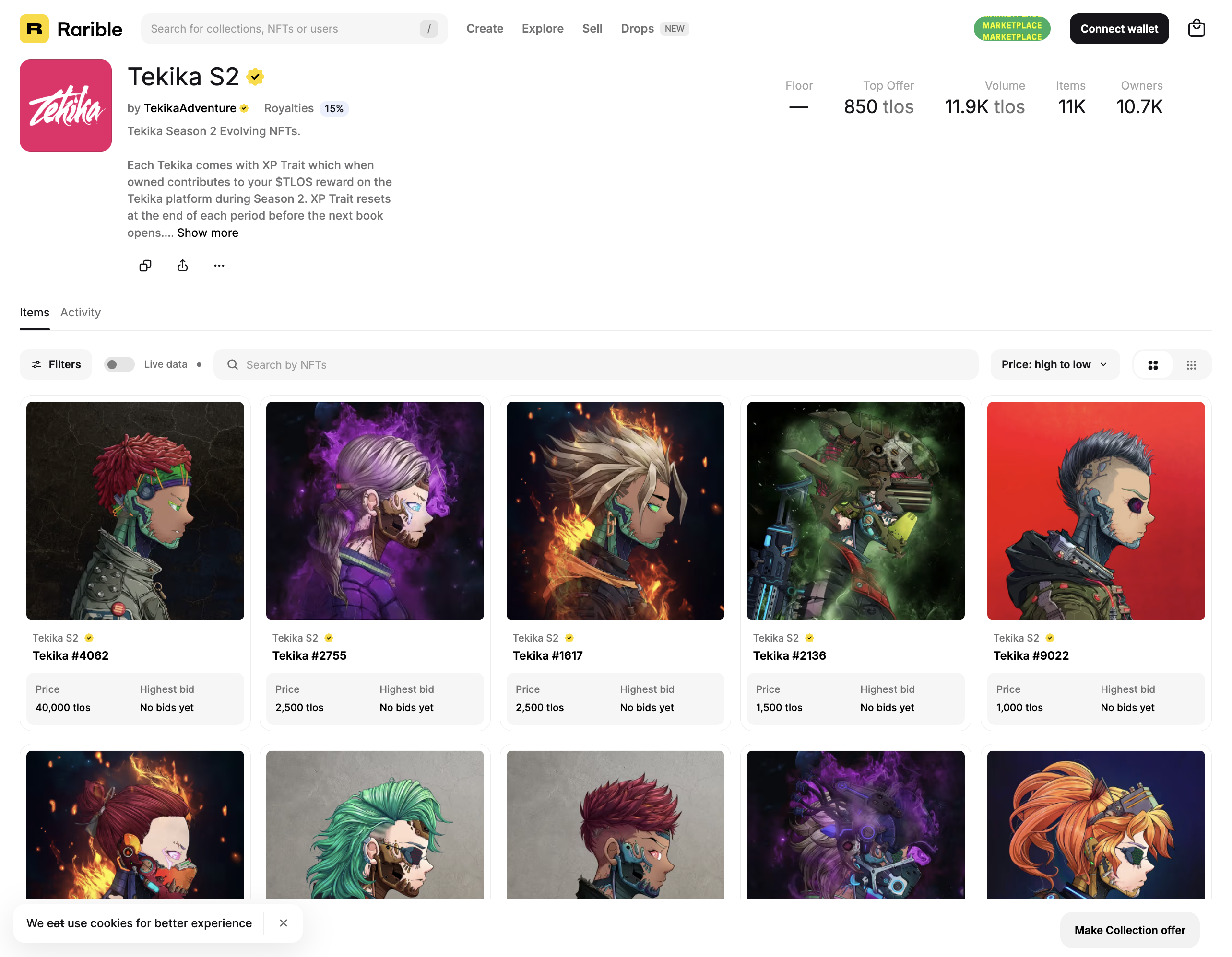 To support secondary market trading, the platform acknowledged and potentially linked to the Tekika S2 collection on Rarible. The description highlighted that NFTs carried XP traits which contributed to the holder's $TLOS reward share on the Tekika platform itself, adding on-platform utility that could influence market value.